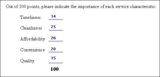 Another type of ranking question is a summing-type, relative rating, question. Here the respondent is asked to allocate some number of total points among a number of attributes or options based on a characteristic, such as importance.